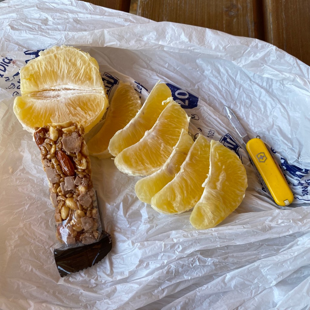 Der Mann, welcher aussieht wie Rübezahl, möchte mir eine Freude machen, da er von der Weitwanderung ganz begeistert ist und bietet mir „eine süße Spezialität“ an. Ich lehne dankend ab. Kurz bevor ich gehe, fällt ihm doch noch etwas ein, womit er mir eine Freude machen kann – und er trifft den Nagel auf den Kopf, indem er mir, schon beim Rausgehen, noch eine Apfelsine zusteckt – DAS ist etwas, worüber Weitwander:innen sich immer freuen! Frisches Obst 🙂