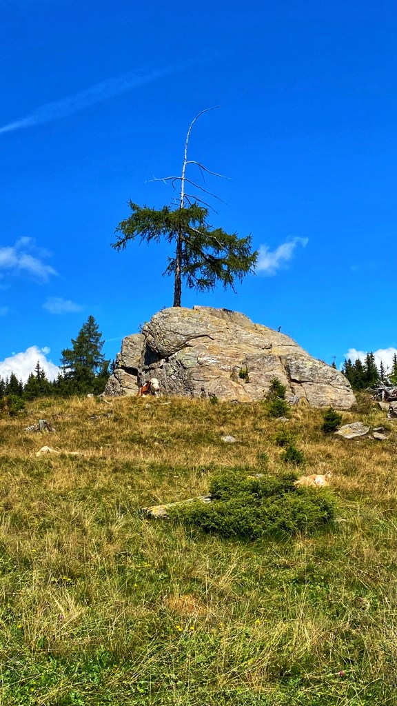 Es geht jetzt nur noch abwärts bis zur Knödelhütte. Hier gibt es einen großen Parkplatz, der gut gefüllt ist. Vor der Hütte sitzen die müden Wander:innen und verspeisen die Spezialitäten. Eine Familie mit vier Kindern sitzt abseits im Halbschatten auf der Wiese und lässt sich die mitgebrachte Jause schmecken.