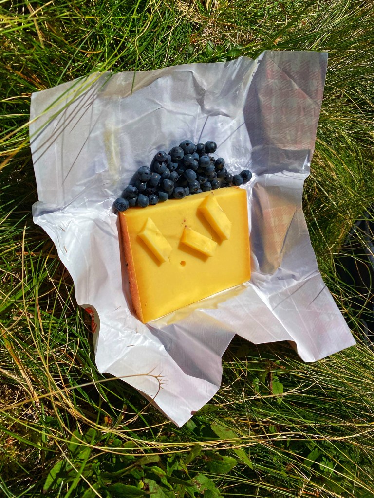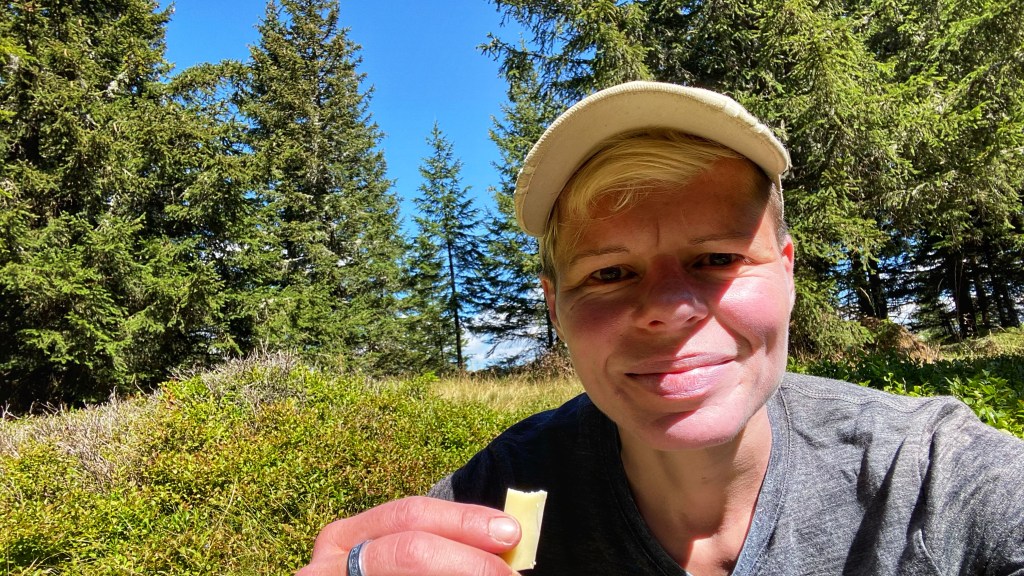 Am Lahnkogel geht es dann wieder in den Wald hinein. An der Bernsteinhütte fülle ich nur Wasser auf und wasche meine Hände, damit ich ein paar Minuten später mitten in einem Heidelbeerfeld zünftige Pause machen kann. Der Bergkäse, den ich gestern frisch gekauft hatte, ist absolut köstlich und die Heidelbeeren kann ich im Sitzen von den Büschen zupfen.