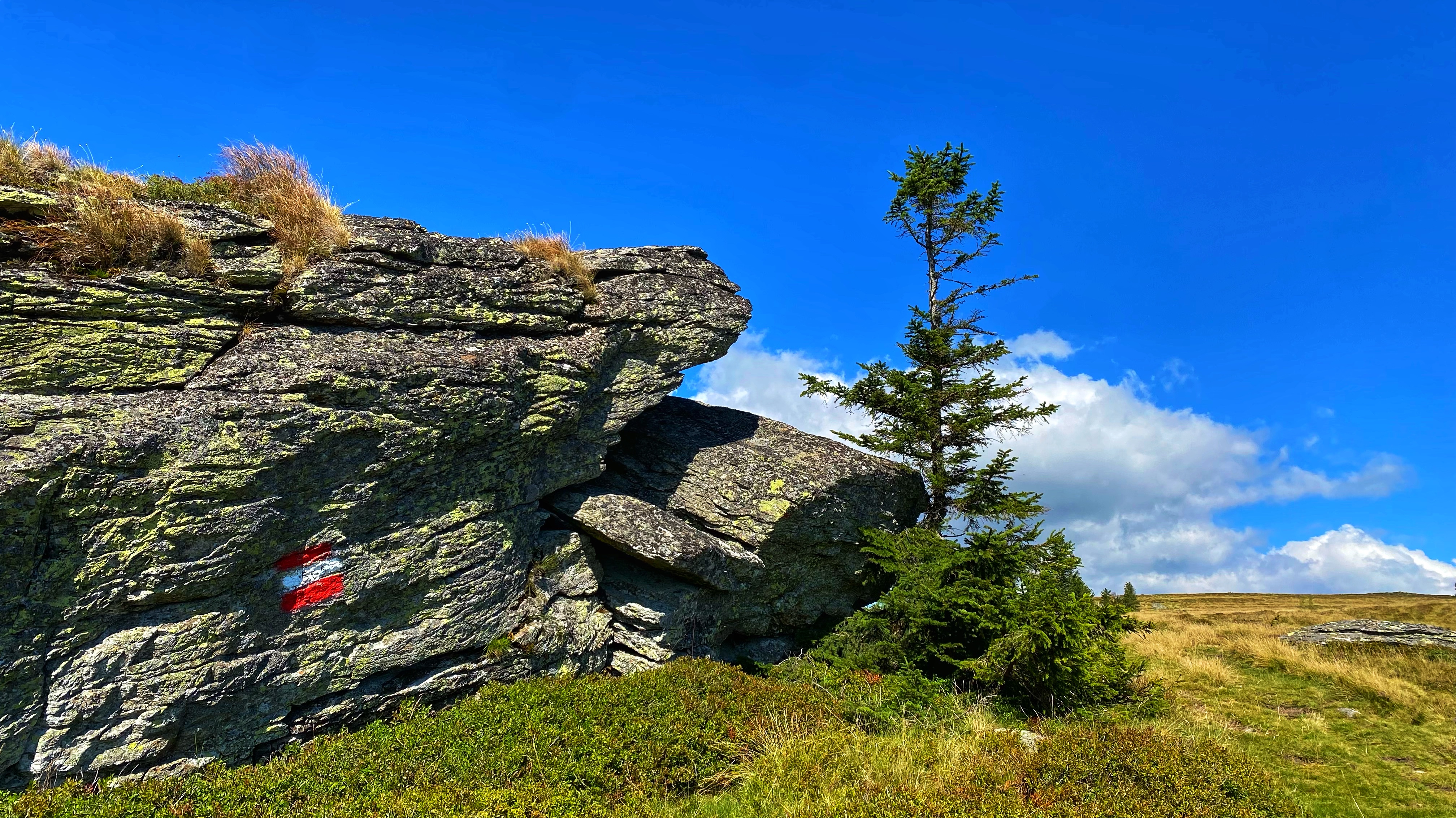 Das Gestein, welches hier und da freigelegt wurde, glänzt wunderbar in der Sonne. Wenn ich richtig informiert bin, ist hier neben Quarz auch Glimmer (Muskovit, Biotit) enthalten. Leider kann ich das Glitzern mit der Kamera nicht einfangen.