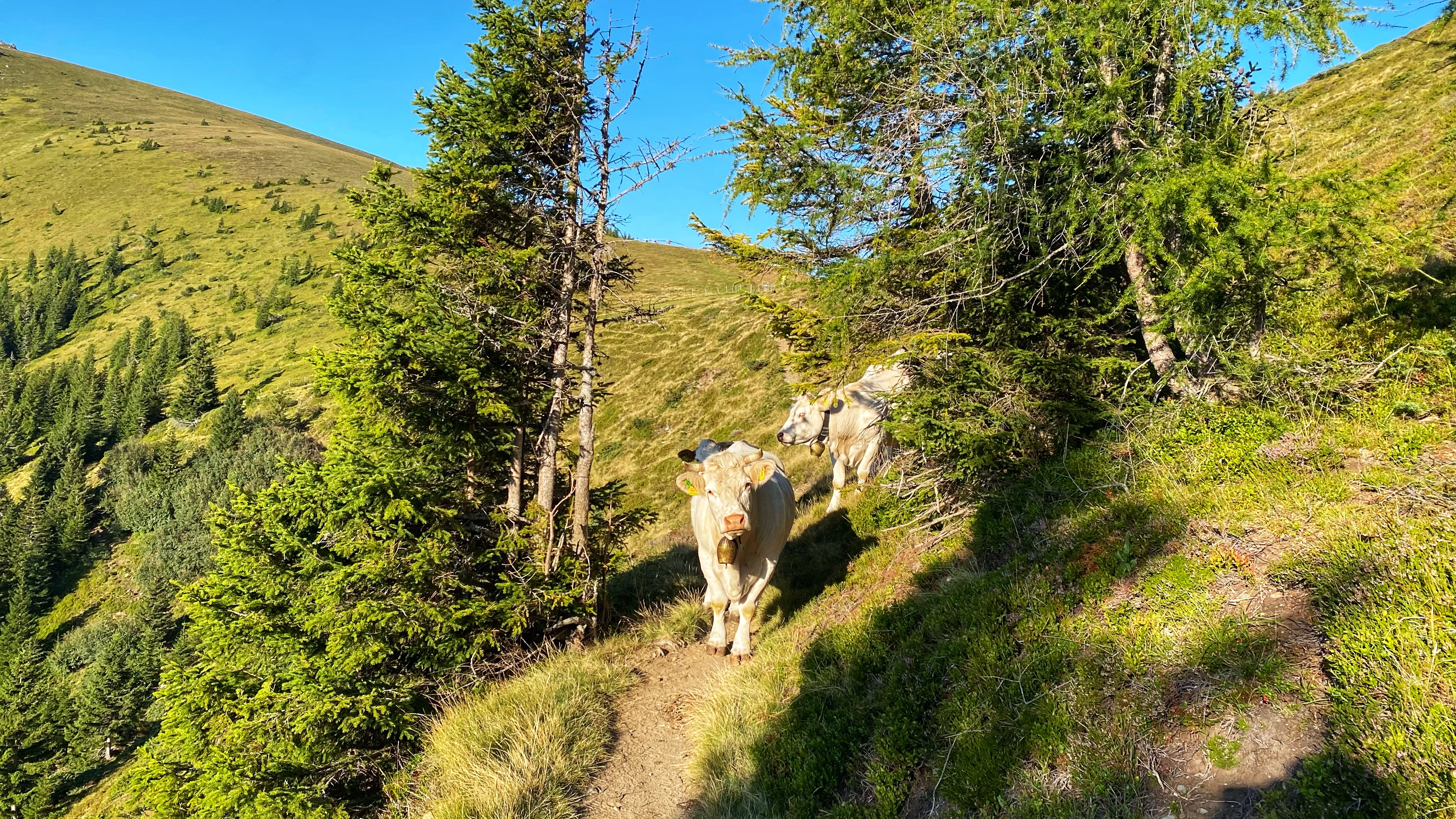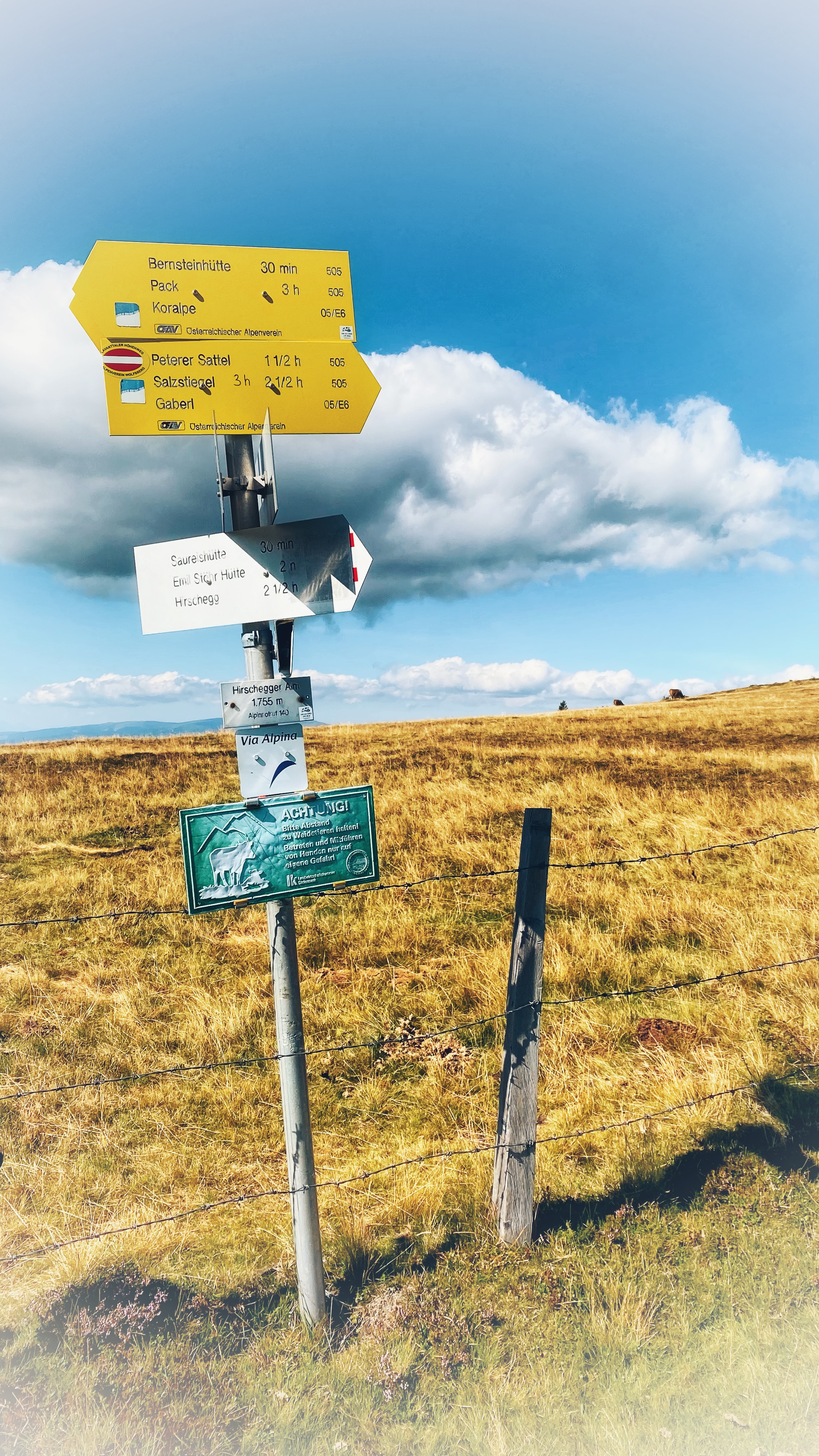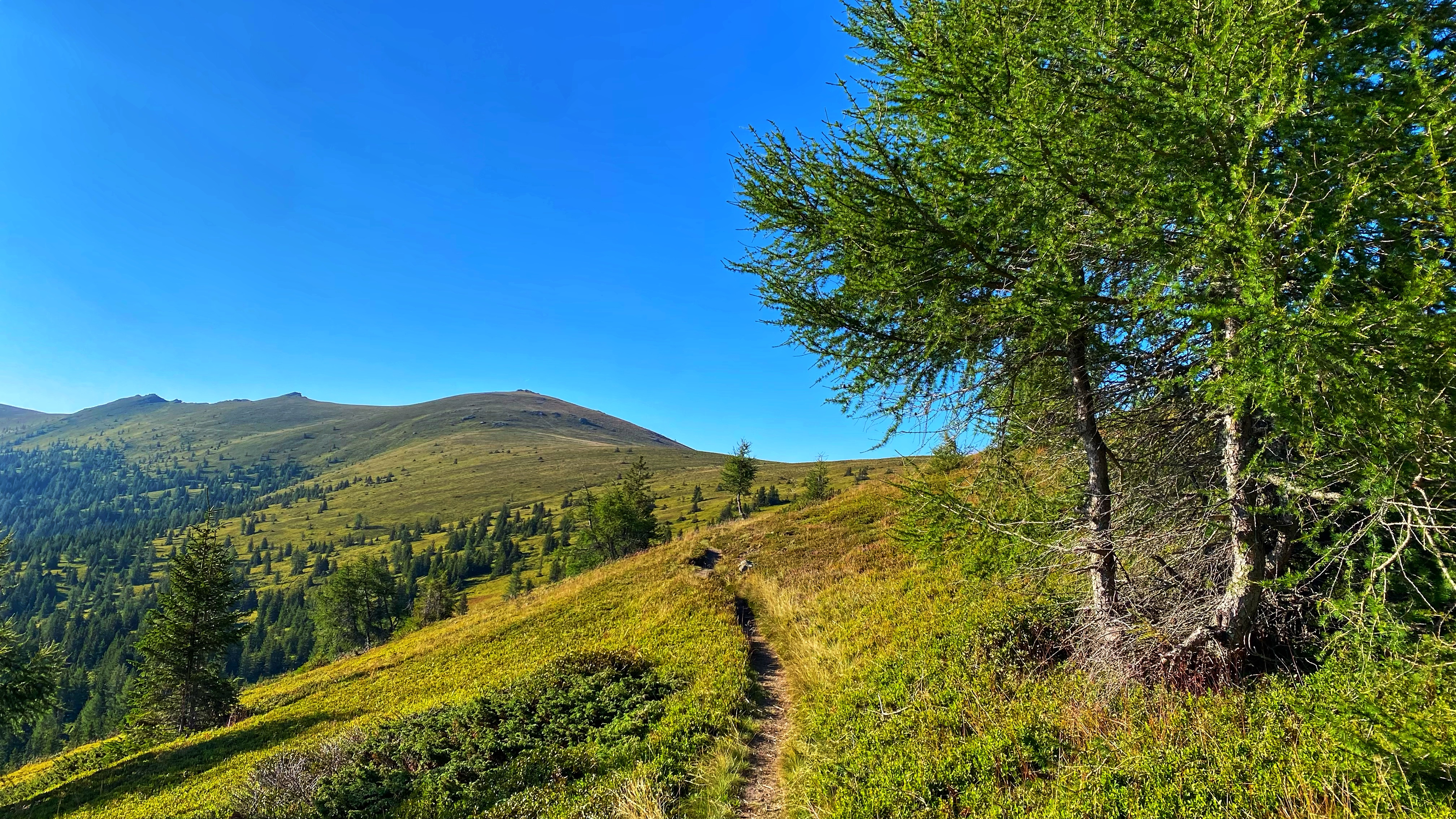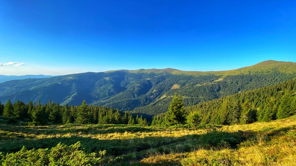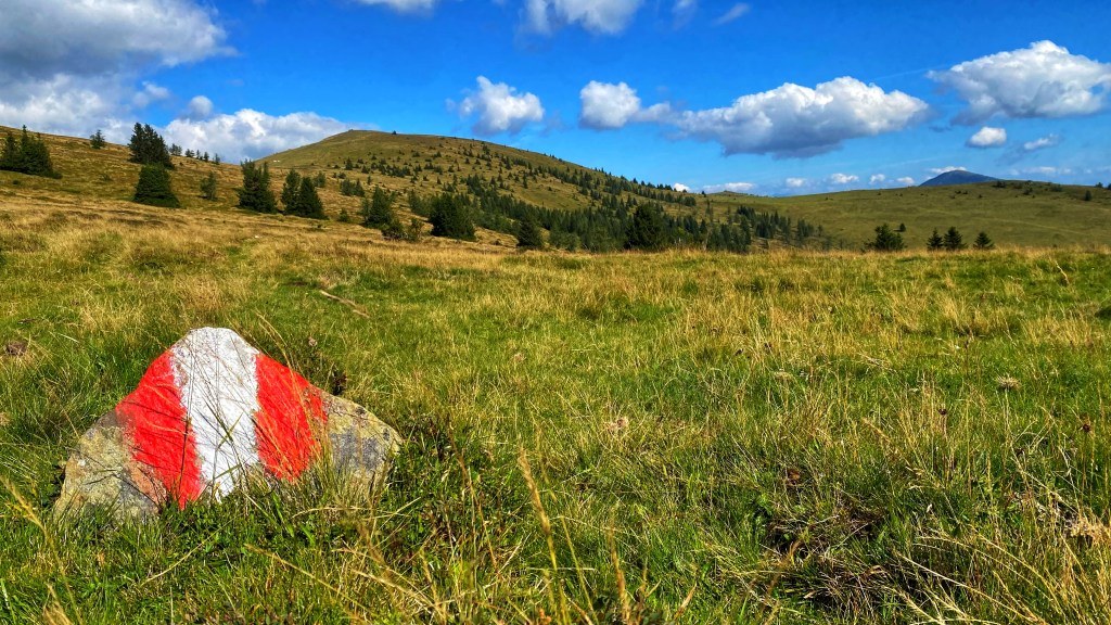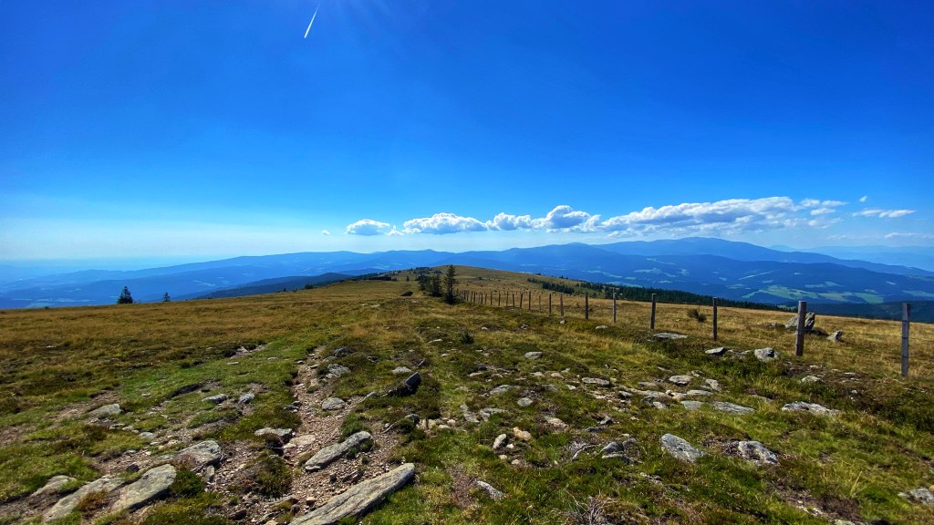 Die heutige Etappe führt größtenteils über die Gipfel der Hirschegger-Alpe bis zum Packsattel und dann weiter über die Koralpe.