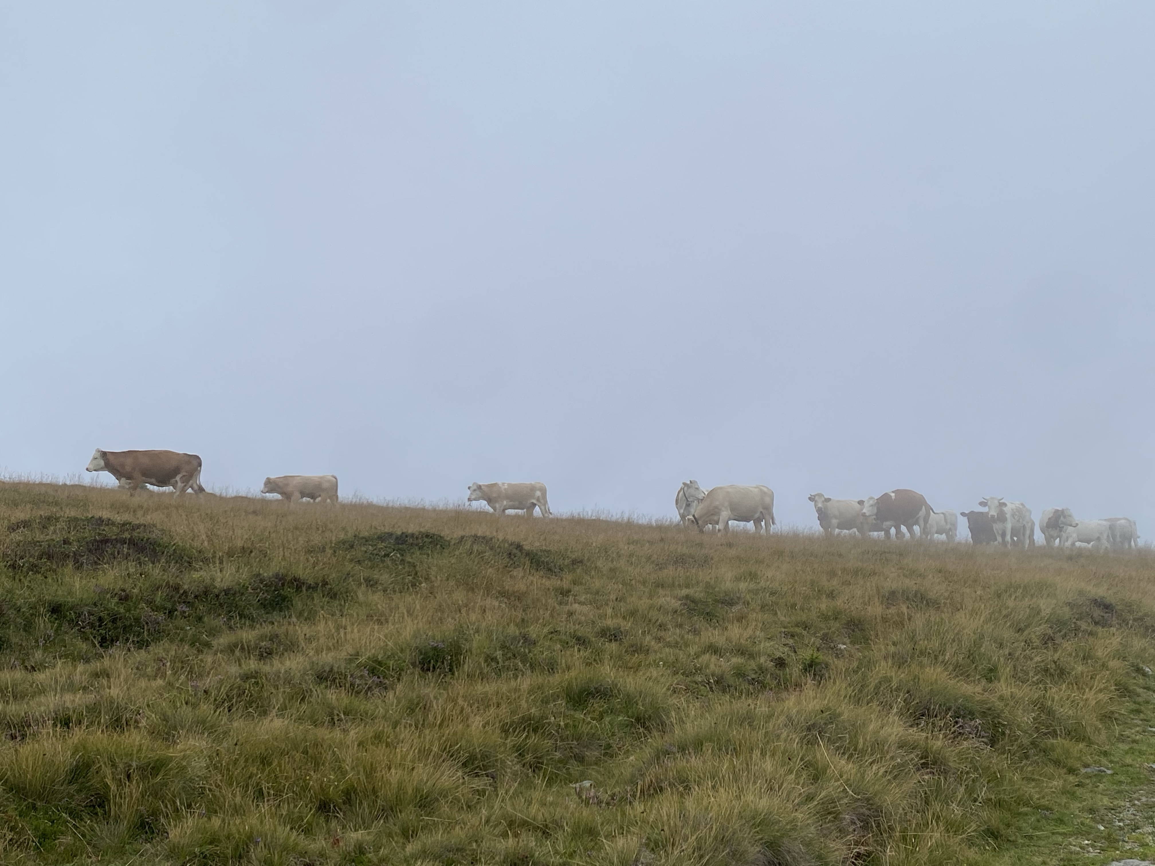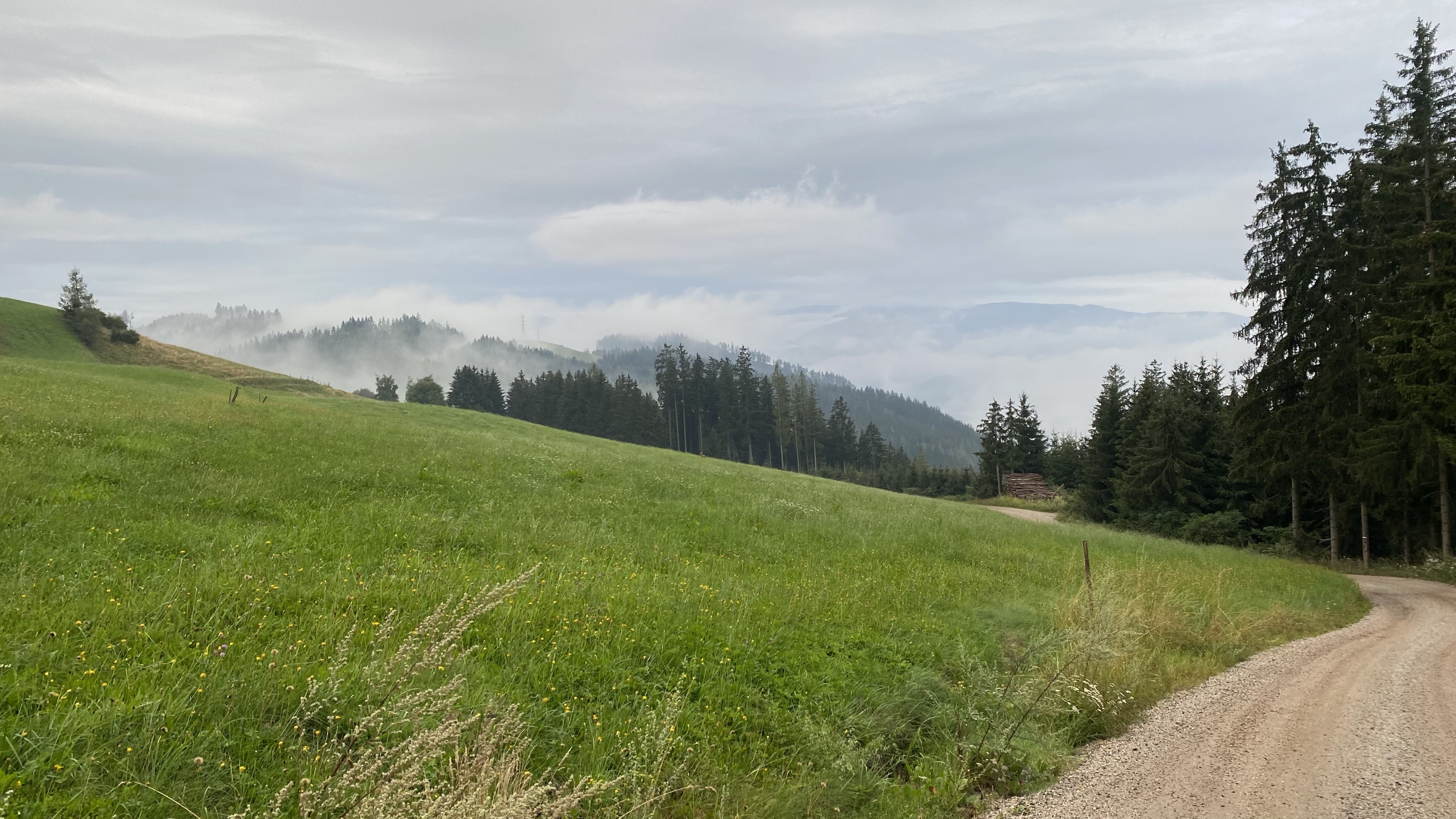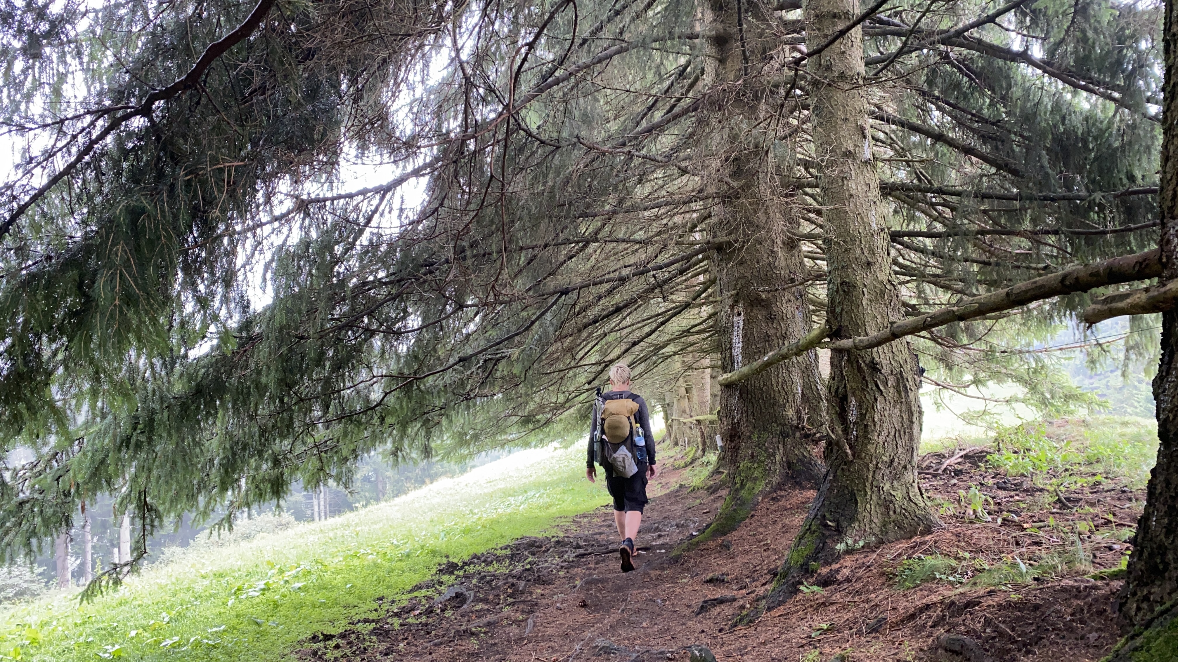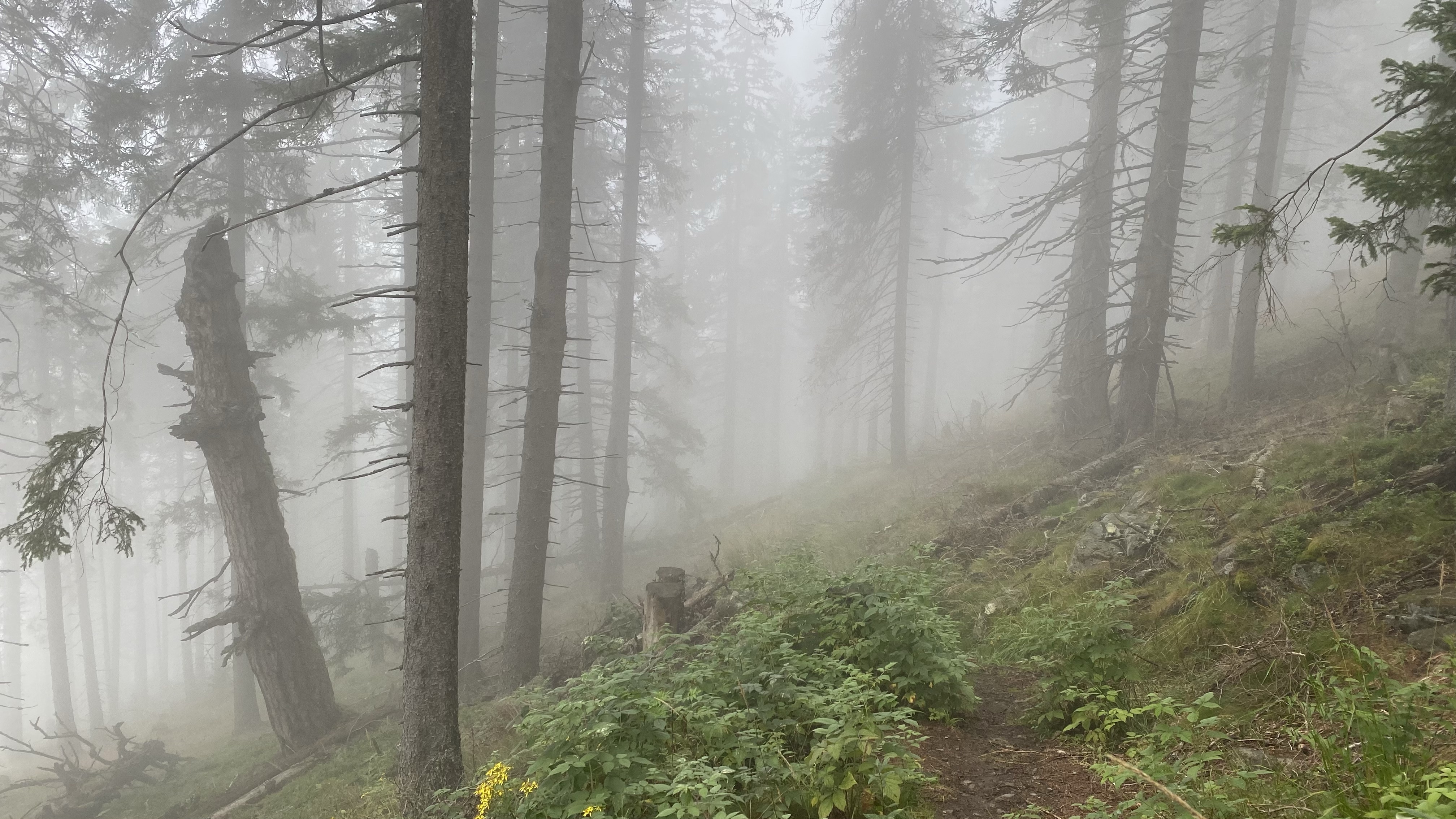 Außerdem ist es eine wundervolle Stimmung. Die Wolken hängen tief in den Baumspitzen über den Tälern und ich kann den ganzen Tag auf sie hinaufsehen. Laut- und schwerelos ziehen die weißen Schwaden durch die Äste und über den Weg direkt vor mir. Ich treffe heute den gesamten Tag über keine anderen Wanderer.