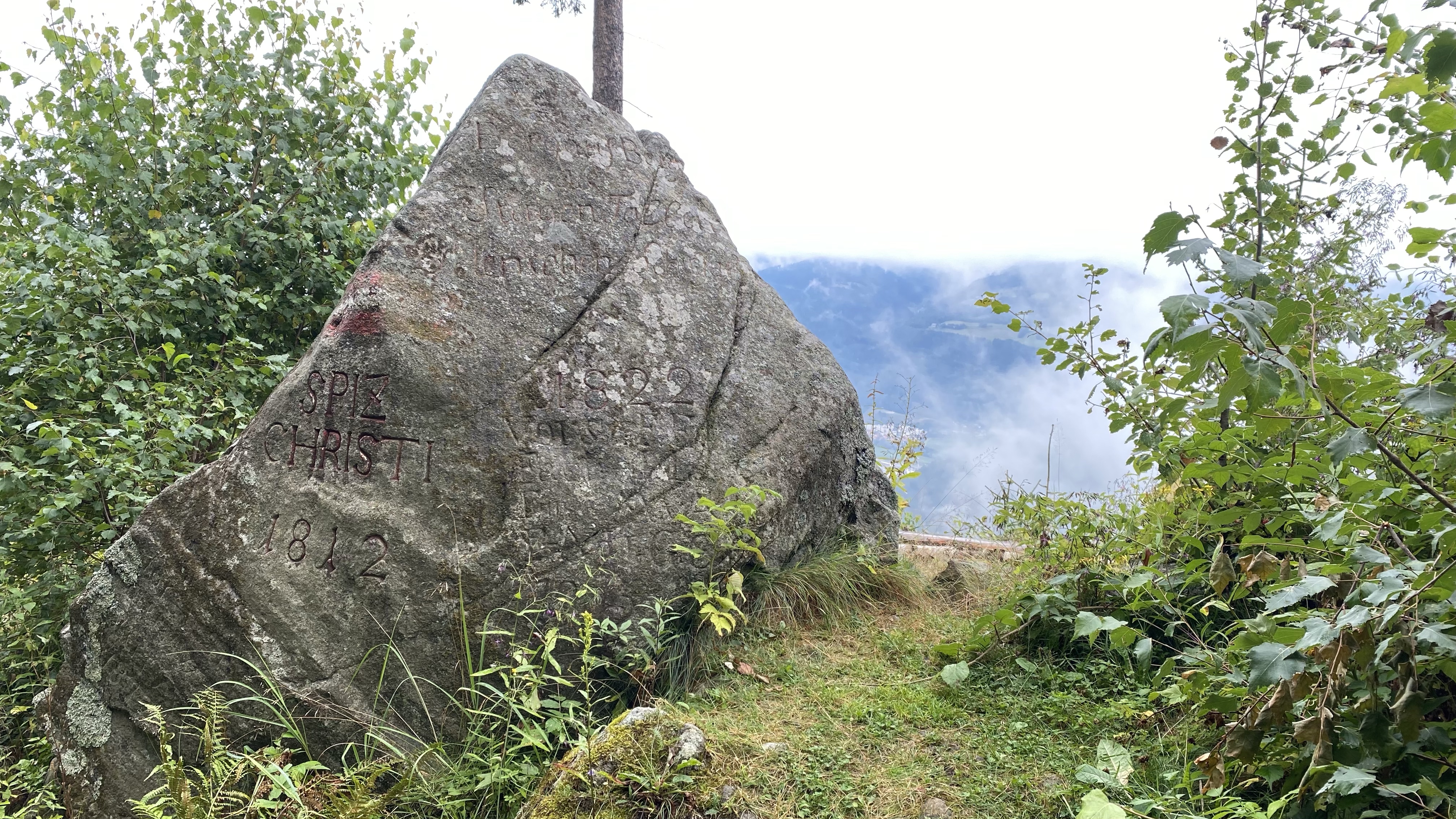 Ich komme am „Spitz Christi“ vorbei, einem mächtigen Steinblock mit der Inschrift :“Bergauf, bergab, steigen, fallen – Menschenschicksal“ und an der Schmollhube, einem Gasthof, der aber nur am Wochenende auf hat.
