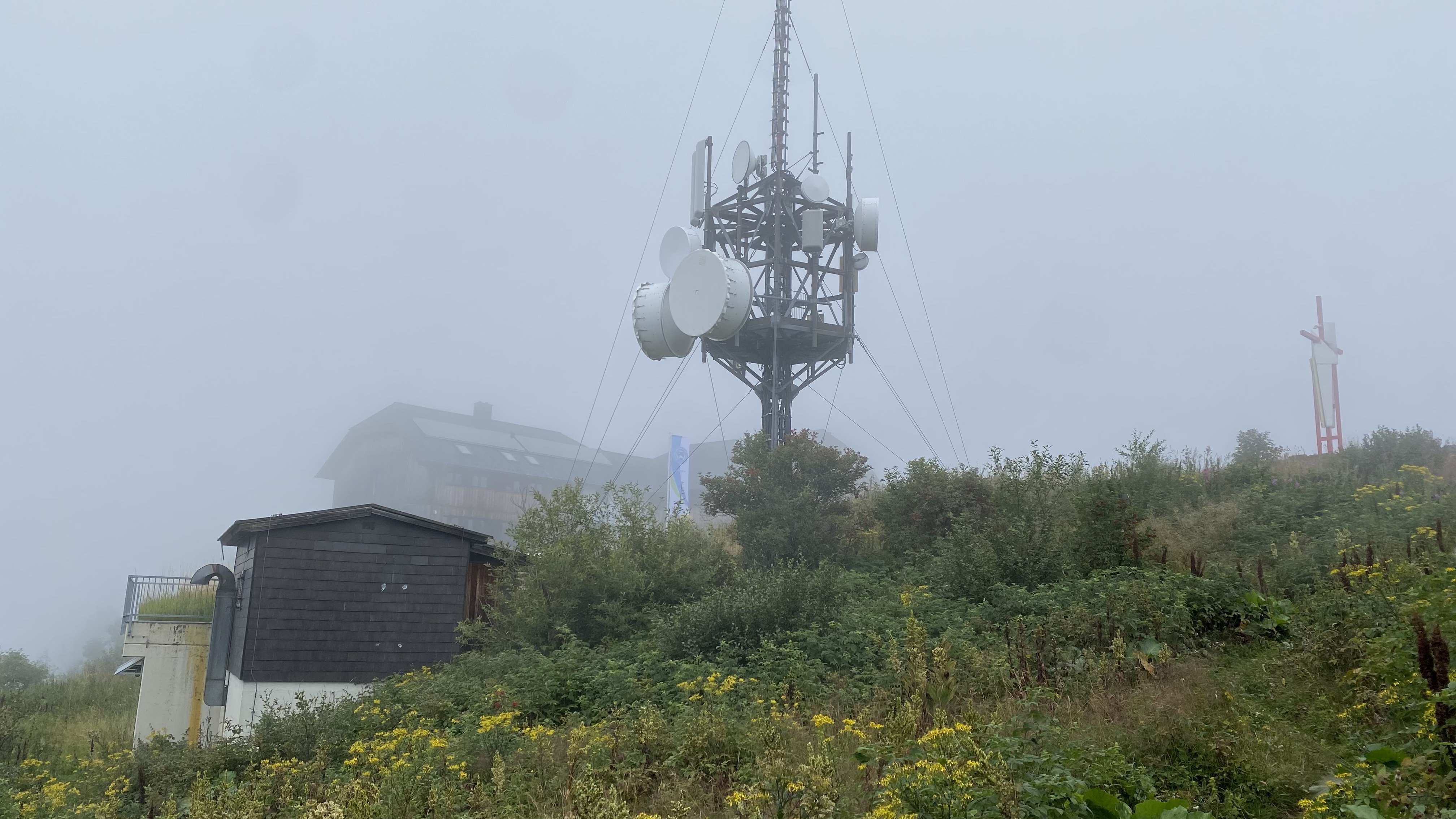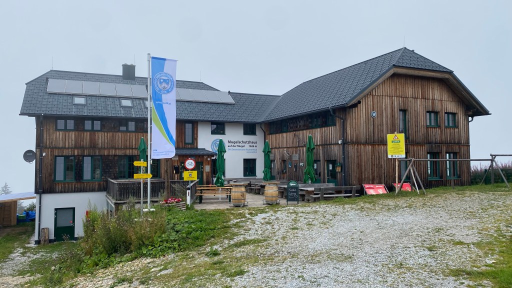 Gegen 14:00 Uhr entdecke ich im Nebel das Mugelschutzhaus und steuere zielsicher auf die Eingangstür zu. Es scheint nicht viel los zu sein, ist bei dem Wetter aber auch nicht zu erwarten gewesen.