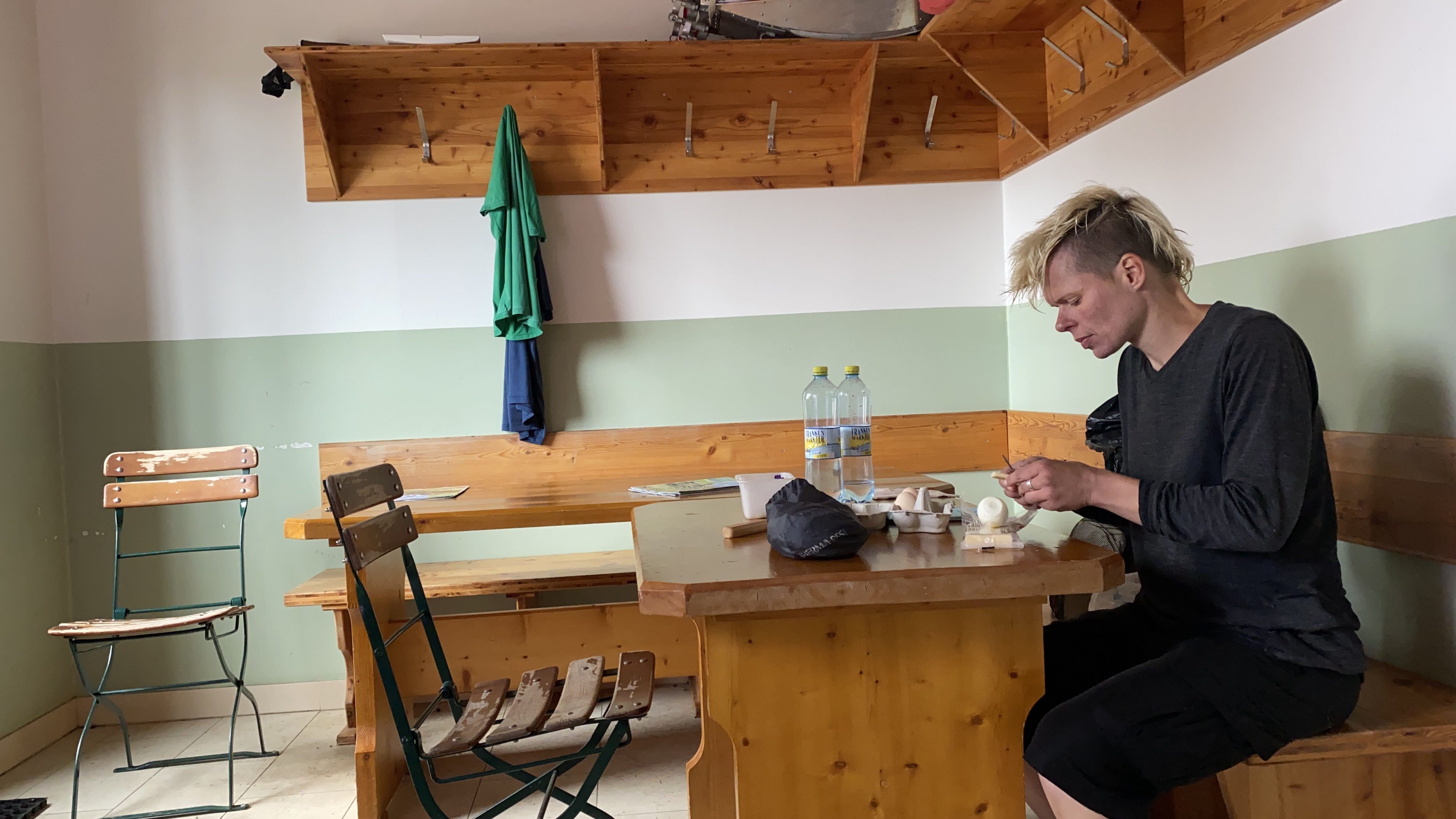 Der Schutzraum ist zumindest offen und gut geheizt und ich verschnabuliere zwei gekochte Eier und einen halben Emmentaler – mjam, super lecker. Das Essen erinnert mich an Neuseeland, da habe ich das sehr gerne auf dem Trail gegessen. 🙂