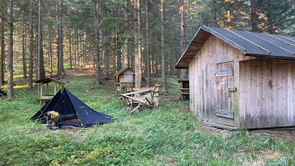 Also gehe ich ein paar Meter und finde ein wunderschönes Plätzchen mitten im Wald an einer Winterfutterstation. Hier ist es sogar noch windgeschützter als unten. Eine Stunde nach der Störung liege ich wieder im Quilt und kann ungestört schlafen.