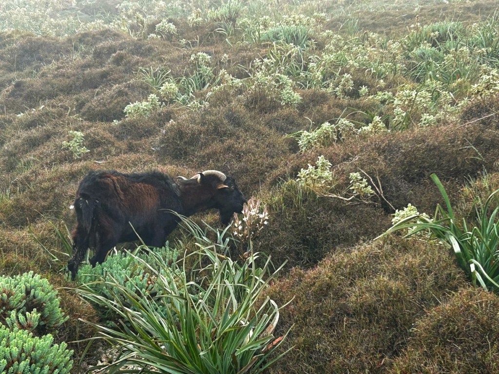 Die Gerölllandschaft wird kurz auf einem Sattel durch Büsche und kleine, knurrige Bäume unterbrochen, bevor es weiter steil hinauf geht.