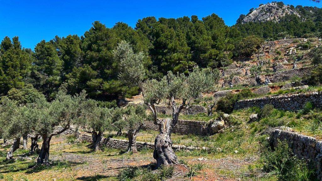 Es geht natürlich wieder bergauf und heute sind die Steinmauern allgegenwärtig. Jede Finca ist damit abgegrenzt und die Grundstücke selbst sind mit Steinterrassen versehen, auf welchen Oliven- und Obstbäume angepflanzt werden.