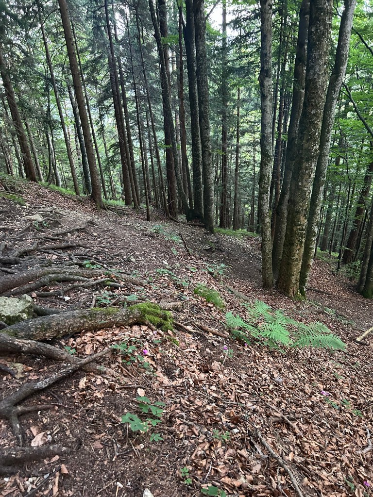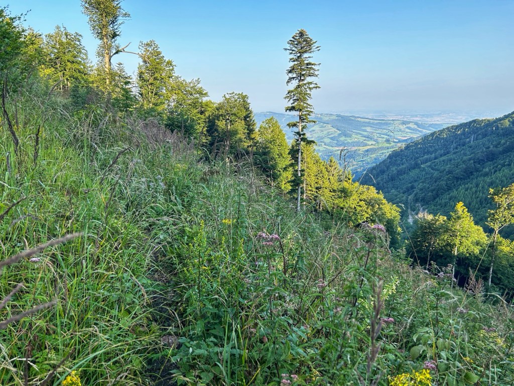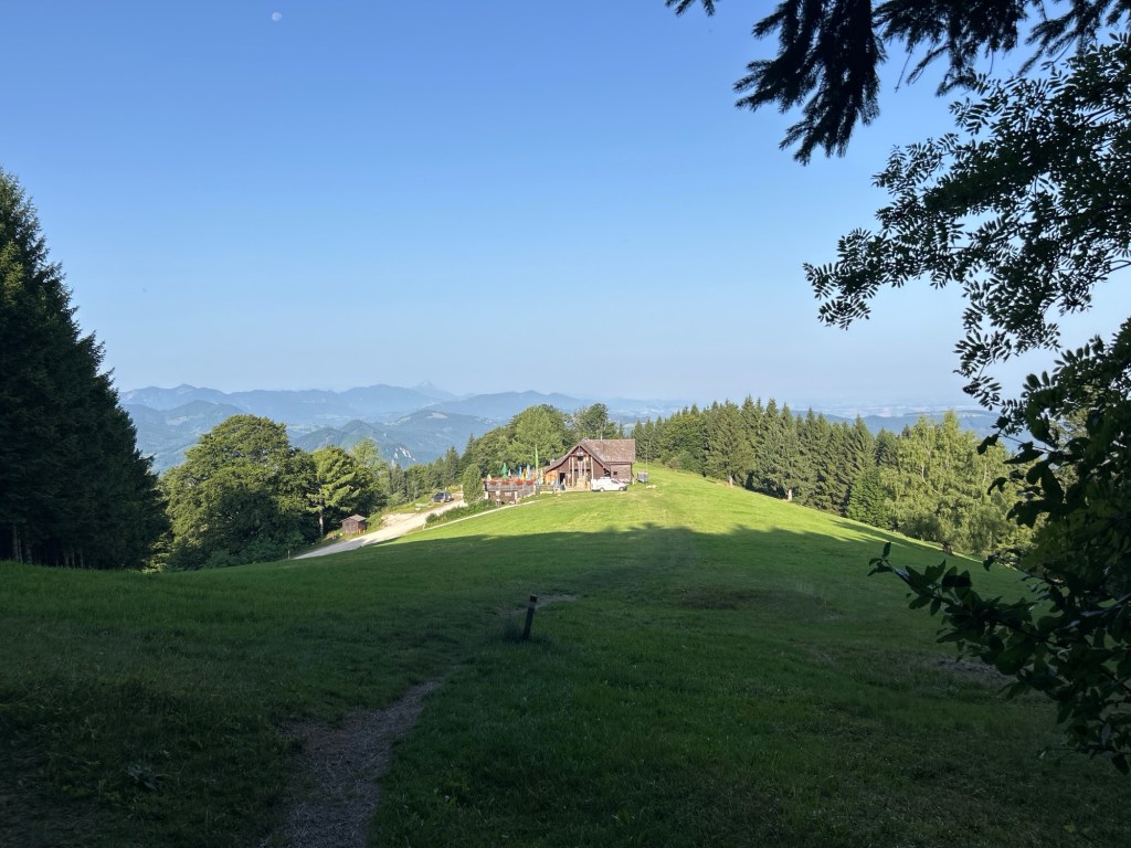 Ab dort geht es erstmal wieder etwas runter, über eine Weide mit schönem Weitblick auf die umliegenden Berge und dann wieder im Wald hoch zum finalen Anstieg zur Grünberghütte.