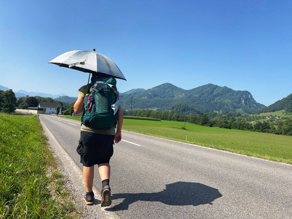 Während ich mich mit meinem Sonnenschirm schwitzend auf dem Seitenstreifen entlang schleppe, wird mir bewusst, dass ich mir die ungünstigste Woche für den Start meiner Wanderung ausgesucht habe, die es dieses Jahr wahrscheinlich gibt. Ab nächster Woche wird es wieder etwas kühler, aber die ersten sechs Tage muss ich hier wirklich bei um die 30° Celsius bewältigen und das dann auch noch auf der schattenfreien Strecke.
