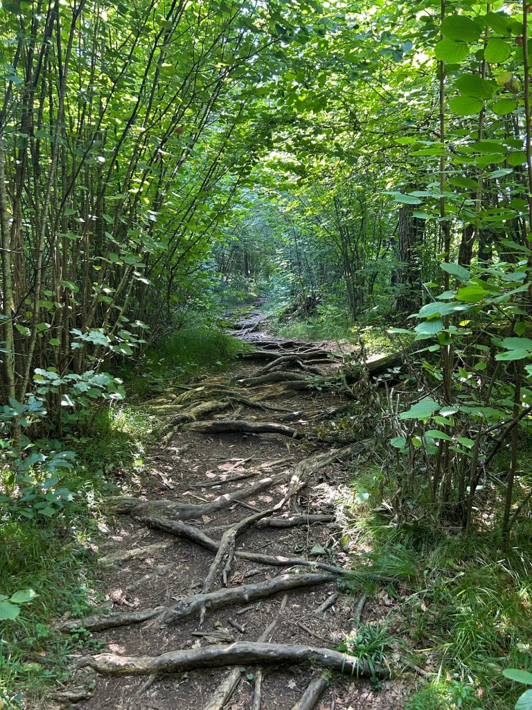 Es ist zwar super anstrengend, sich über die Wurzeln zwischen den Bäumen hin und her zu schlängeln, aber das mache ich trotzdem hundertmal lieber, als in der prallen Sonne eine Straße lang zu latschen. Hier weiß ich wenigstens, warum ich ins Schwitzen komme.