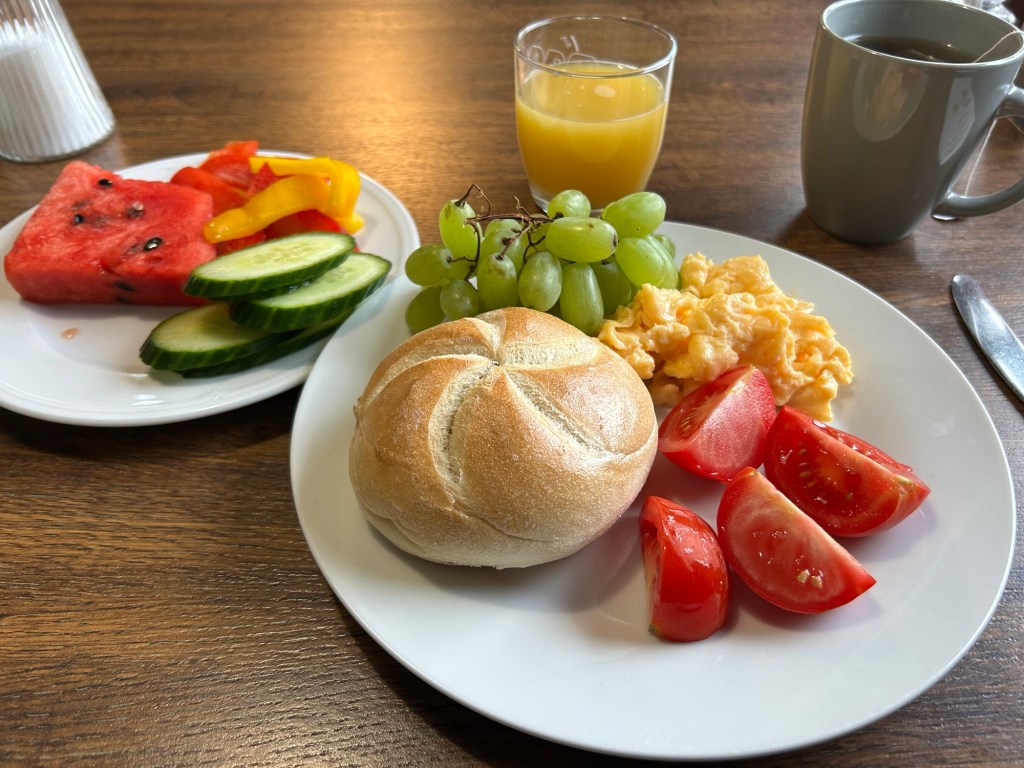 Lediglich das Frühstück lasse ich mir nicht entgehen und haue ordentlich rein. Die frischen Brötchen und das Gemüse sind ein Traum.