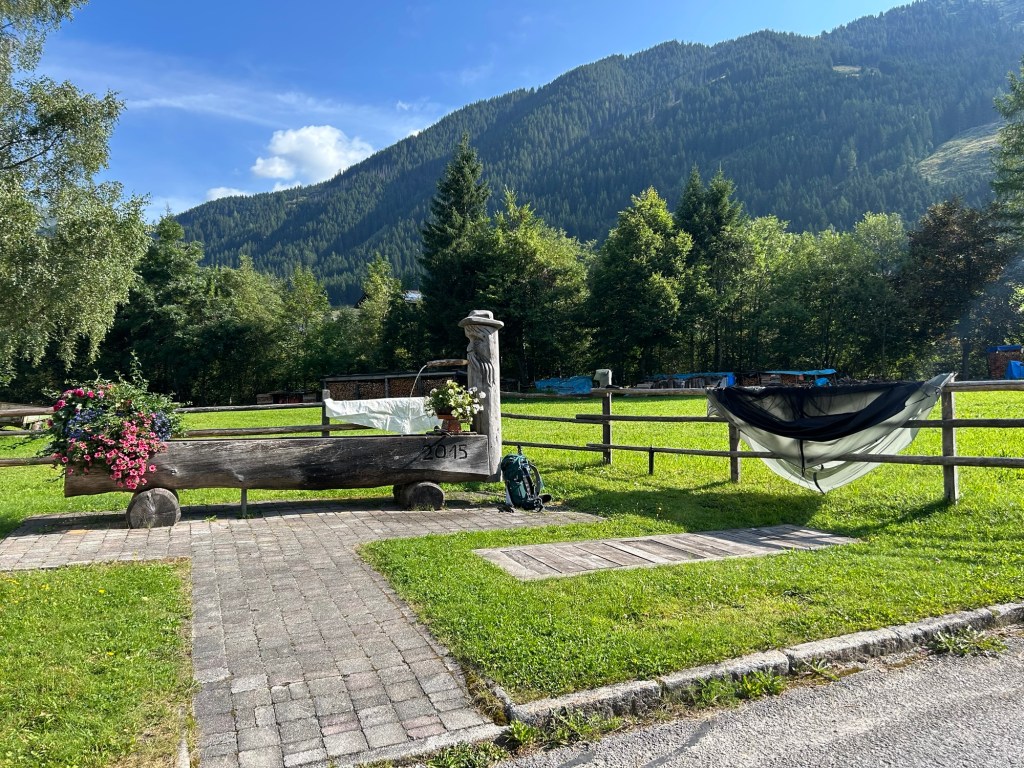 Dort nutze ich die perfekten Gegebenheiten, um mein Zelt zu trocknen und die Wasserflaschen aufzufüllen. Während das Zelt trocknet, kann ich entspannt auf einer Bank im Schatten sitzen und an meinem Blog schreiben.