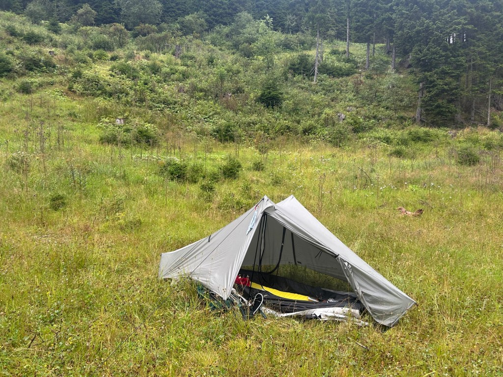 Es regnete immer noch und so baute ich in Rekordzeit das Zelt auf. Das Tarptent lässt sich wirklich sehr gut und innerhalb von fünf Minuten aufstellen und ich achtete auf ein regensicheres Setup.